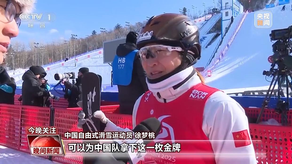 中国自由式滑雪运动员徐梦桃:非常高兴,可以为中国队拿下这一枚金牌,也为我自己拿下了亚冬会第一枚金牌。我还是第一!