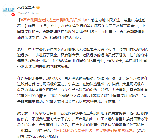 赛后,中国香港代表团团长霍启刚接受大湾区之声记者采访时,对中国香港冰球队遭遇袭击一事进行了回应。霍启刚表示,港队遇袭的运动员受了轻伤,他们的身体健康“只能说还可以”,但仍然参与到了昨晚的比赛当中。作为团长,霍启刚对中国香港冰球队的表现感到非常骄傲。